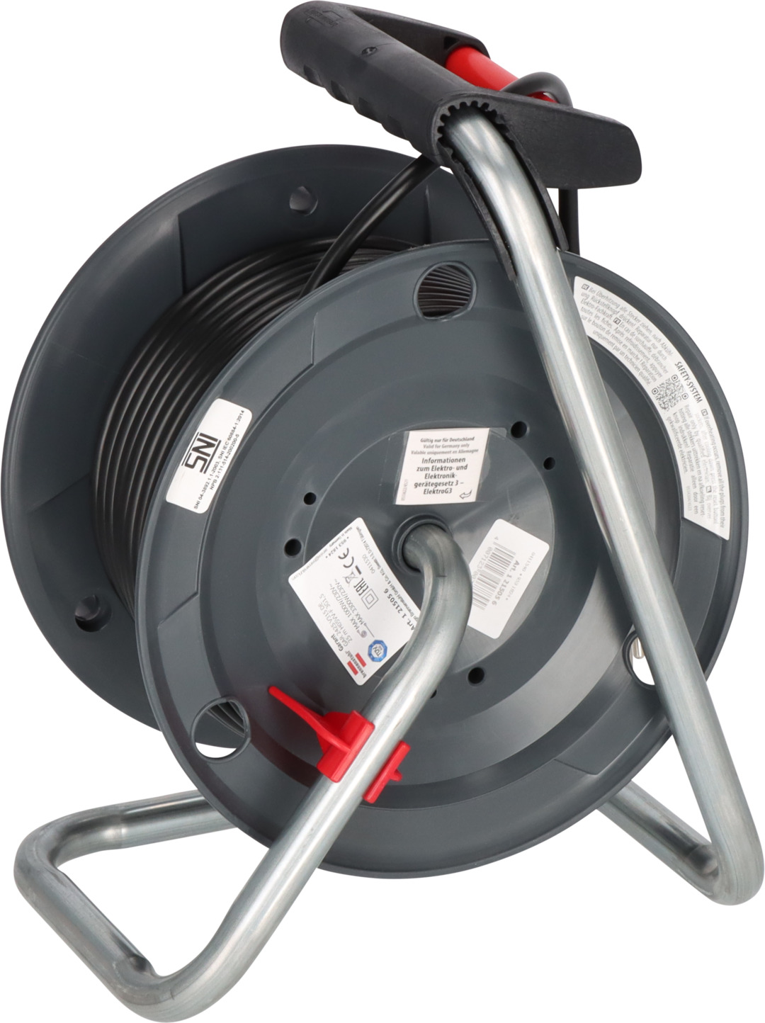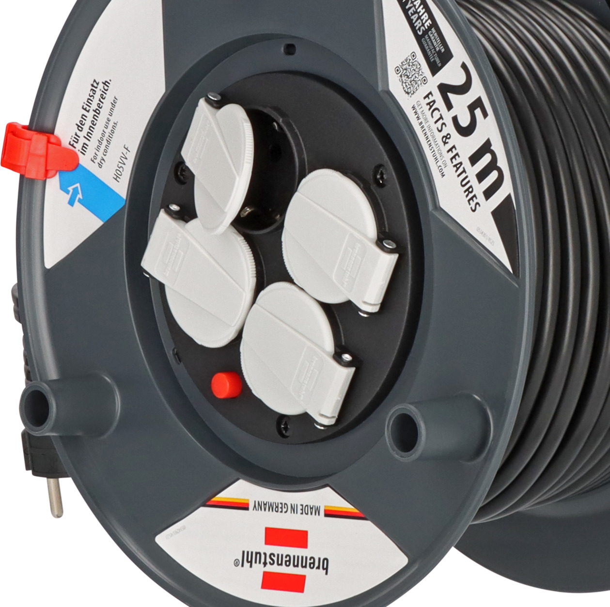 Kaablitrummel 25 m PVC-kaabliga on mõeldud kasutamiseks sisetingimustes. Trumli korpus on valmistatud spetsiaalsest plastist ja kinnitatud galvaniseeritud terastoruraamile. See on varustatud 4 maandatud pistikupesaga, millel on isesulguvad katted, ning ülekuumenemiskaitsega. Ergonoomiline käepide tagab mugava kaabli juhtimise kerimisel.