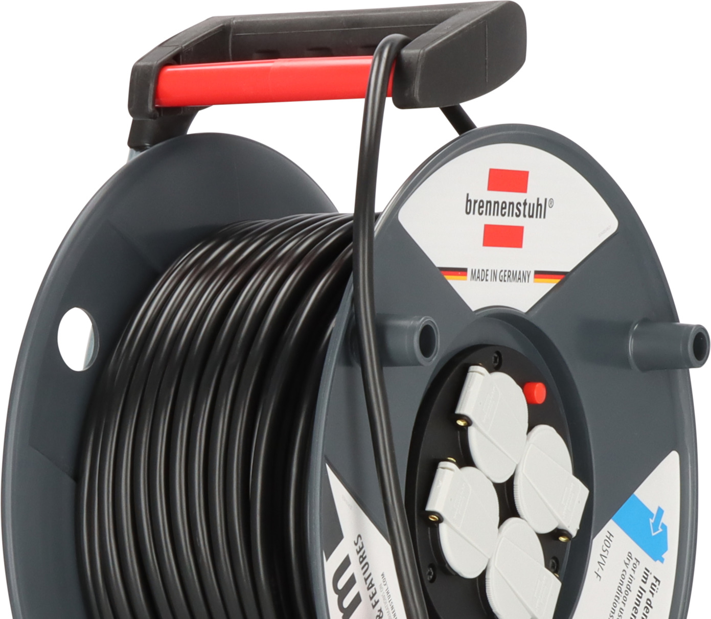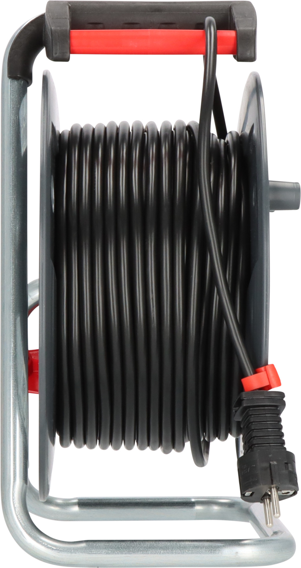 EXP kaablitrummel 50 m PVC-kaabliga on mõeldud kasutamiseks sisetingimustes. Trumli korpus on valmistatud spetsiaalsest plastist ja kinnitatud galvaniseeritud terastoruraamile. Seade on varustatud 4 maandatud pistikupesaga, millel on isesulguvad katted, ning ülekuumenemiskaitsega. Ergonoomiline käepide võimaldab mugavat kaabli kerimist ja juhtimist.